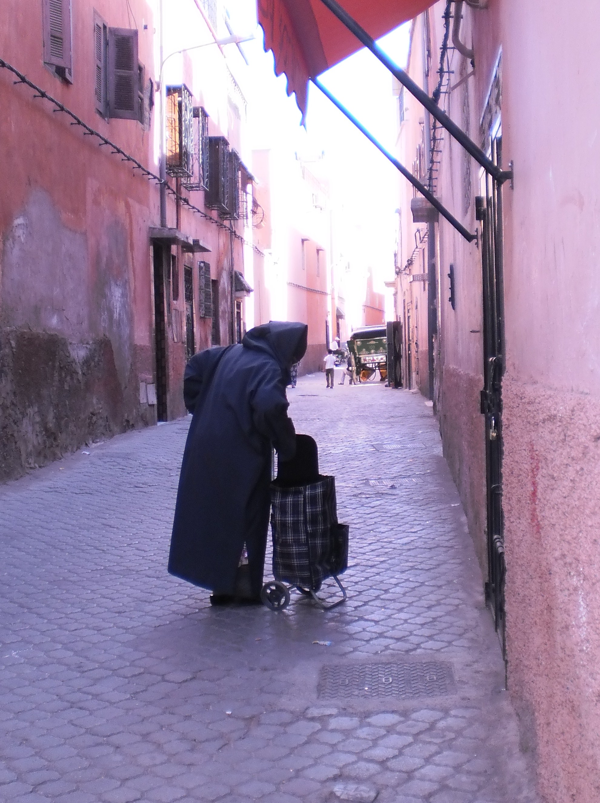 En las callejuelas de la Medina de Marrakech, una anciana acomoda los paquetes de la compra.