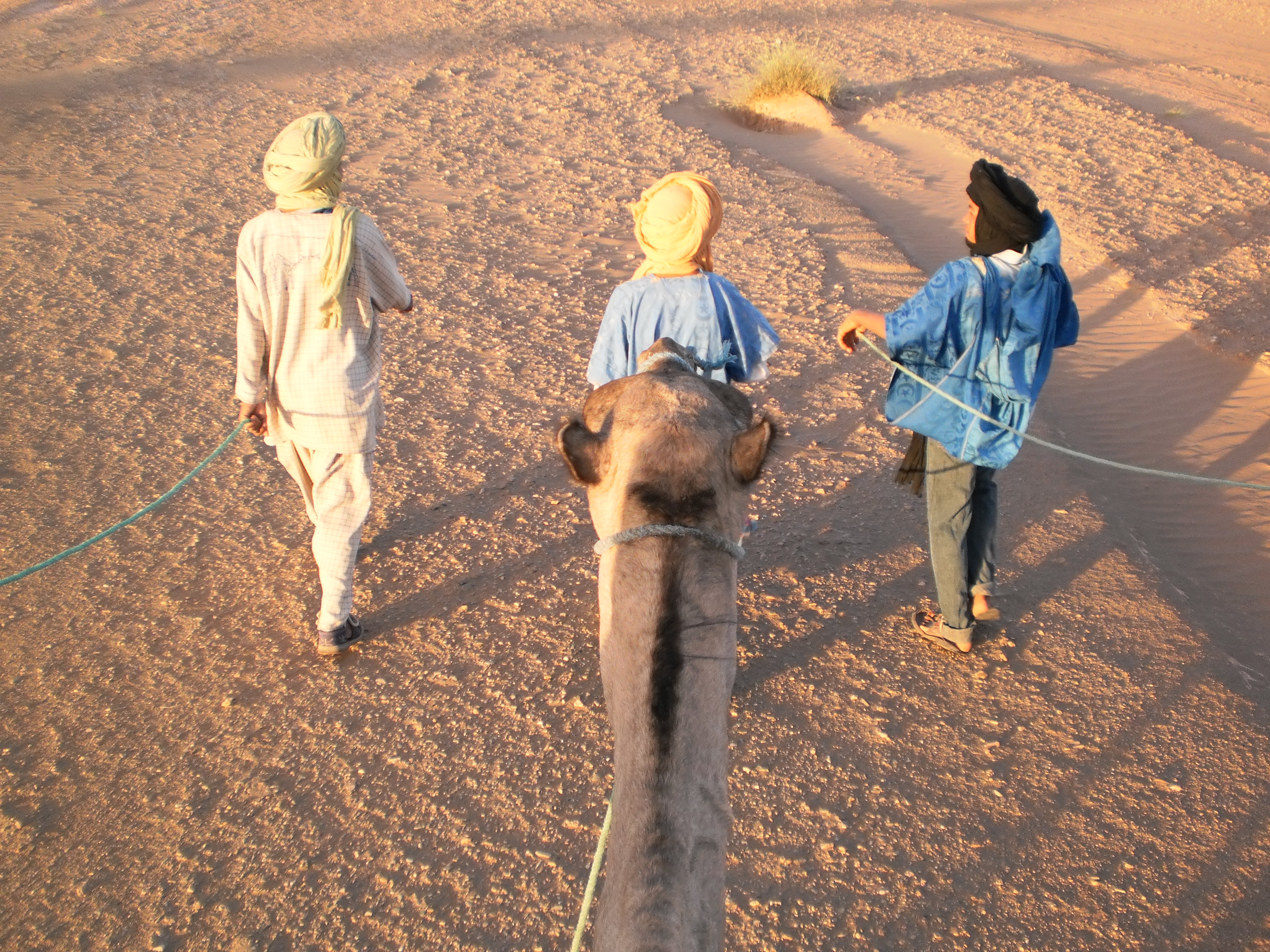 Caravana de camellos, desierto y campamento bereber, en mi imaginario, tenían aspecto bien distinto a lo que encontré en una excursión turística. Los camellos, dispuestos en filas de a cuatro, unidos entre si por una cuerda, eran tirados por los guías, que iban adelante, caminando. Vestidos con la túnica típica bereber y el largo pañuelo enrollado en la cabeza, bajo los pliegues de la tela aparecían los pantalones de jean y las camisetas del Barça.