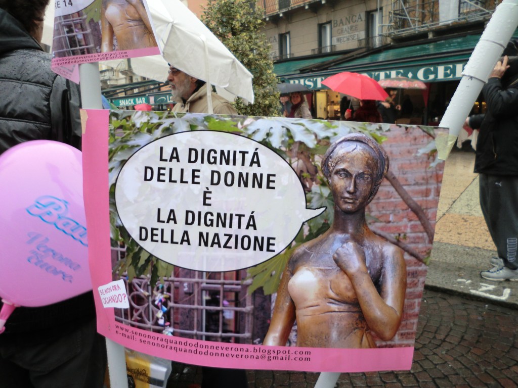 «Le tette non fanno curriculum» decía una pancarta. Ninguna de las acusaciones contra Berlusconi es considerada delito, salvo la acusación que implica a la bailarina marroquí «Ruby» por ser menor de edad. Contratar prostitutas no es delito. Hacer fiestas con muchas mujeres no es delito. Elegir las integrantes de las listas electorales o del gabinete según el criterio personal del líder no es delito. No es contra los delitos, de los que se encargará la justicia, sino contra una forma de ver la política, que se indigna la opinión pública. Arianna, una estudiante de 22 años, lleva una pancarta que dice «Berlusconi, tu gobierno de vedettes me averguenza». Dice que la vida privada de los gobernantes si es una cuestión pública. «No es posible que los cargos del gobierno se adjudiquen a las amantes del Primer Ministro o del Presidente, o que para acceder a un lugar en política se necesiten un par de tetas y no una laurea».