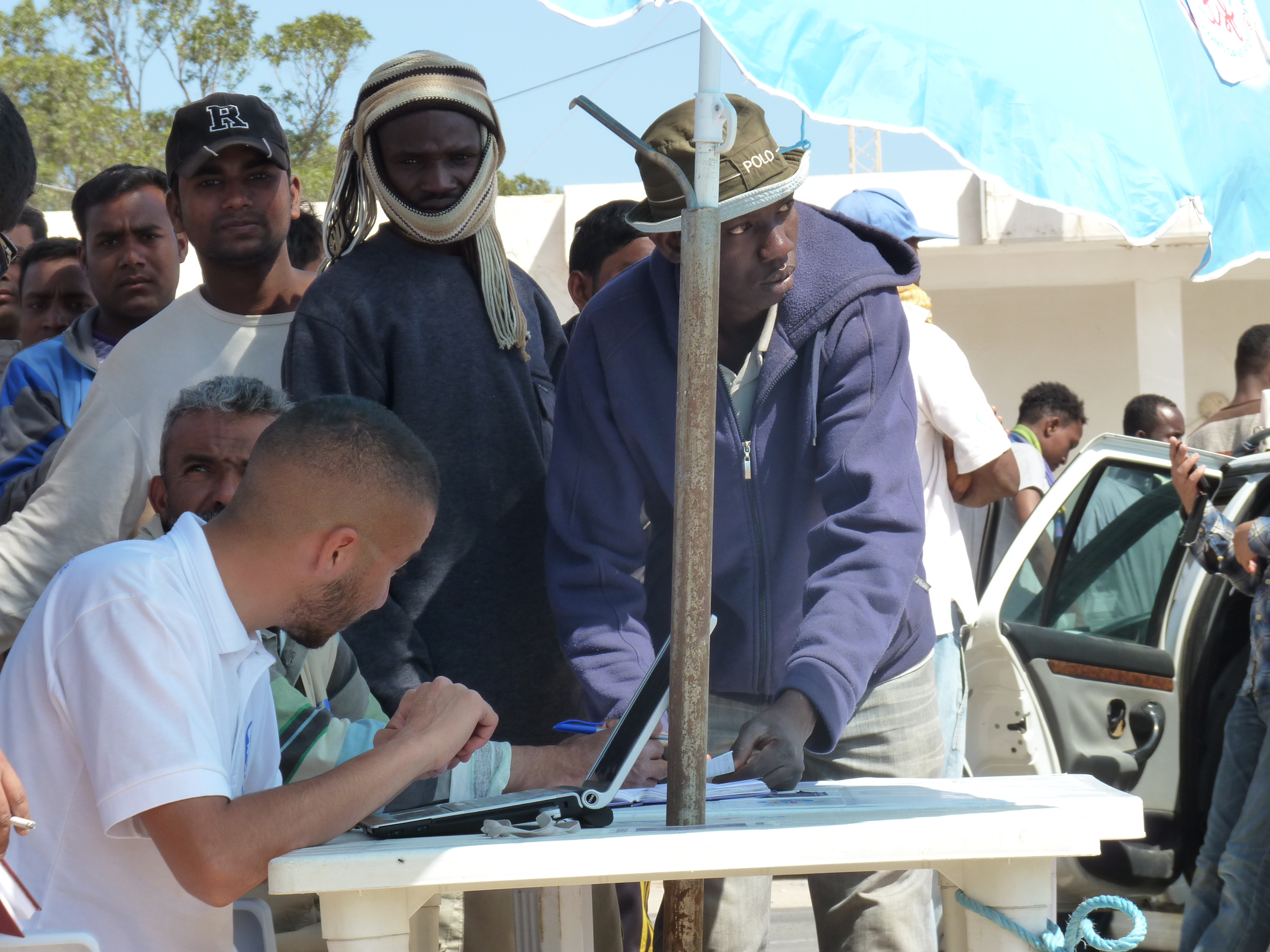 Islamic Relief, con una camioneta a la salida de la aduana y unas cuantas carretillas distribuye bolsitas con un sándwich, dulces y agua a los recién llegados. Algunos, agotados, toman el agua de un sorbo y casi sin respirar se comen el sándwich. Otros aceptan la bolsita pero sin entender qué es lo que les ofrecen. Llevan demasiadas horas de terror, de controles extenuantes en territorio Libio, y de esperas interminables cargando la vida entera en sus maletas. No les queda aliento más que para sentarse y respirar hondo. El periplo no ha terminado, pero al menos están en territorio amigo.